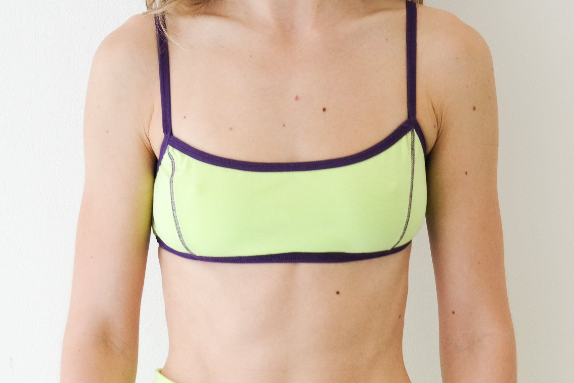 Poison Pop- neon green with a deep purple snap.Playful and sharp with just the right edge- like sweet fruit with a wild kick.Finished with a dark purple elastic band and gold heart sliders to adjust the fit your way.
