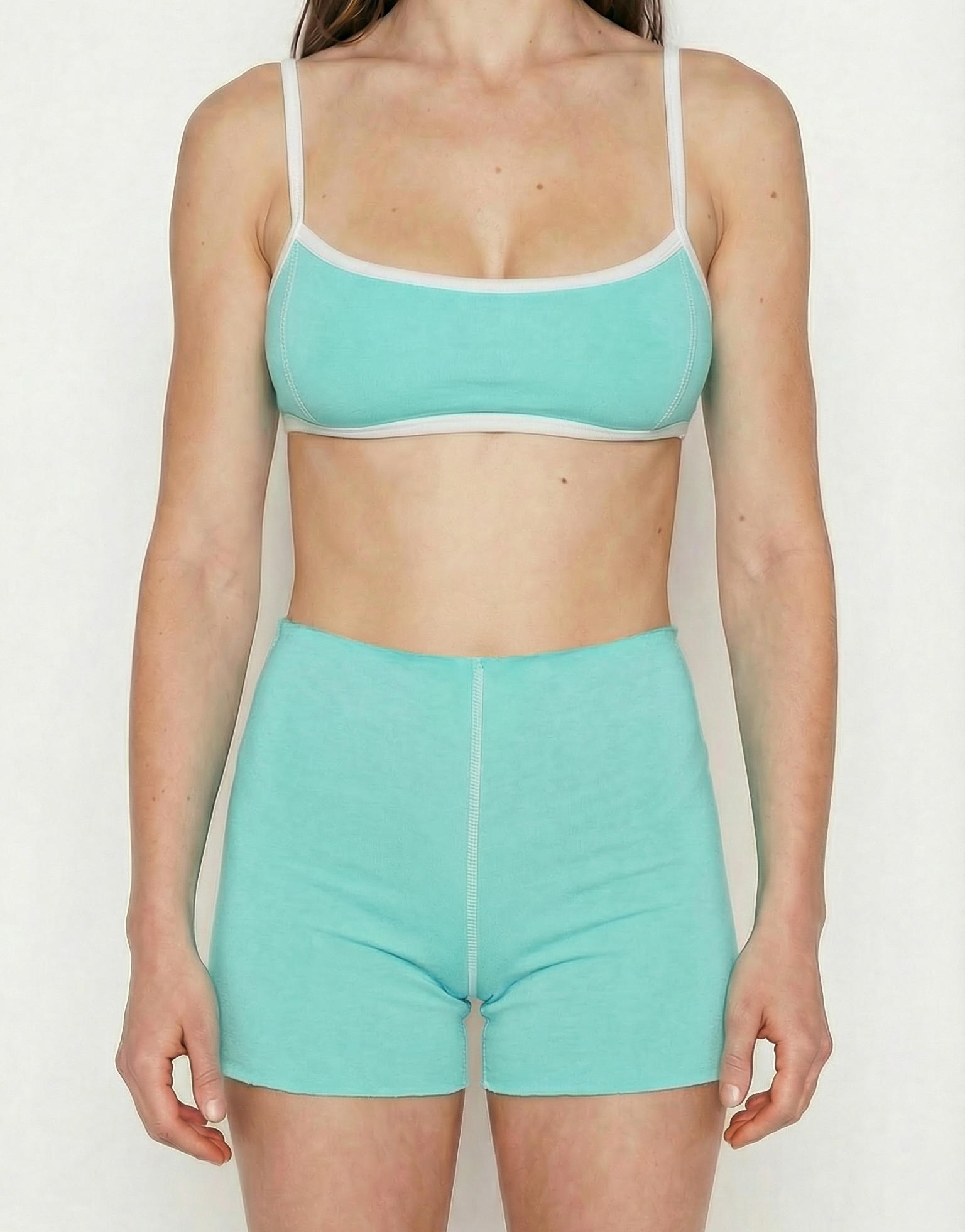 Fresh turquoise with crisp white seams. Light, playful, and full of energy- like cool water on a sunny day.Finished with exposed white overlock seams down the center for a clean, sporty edge.