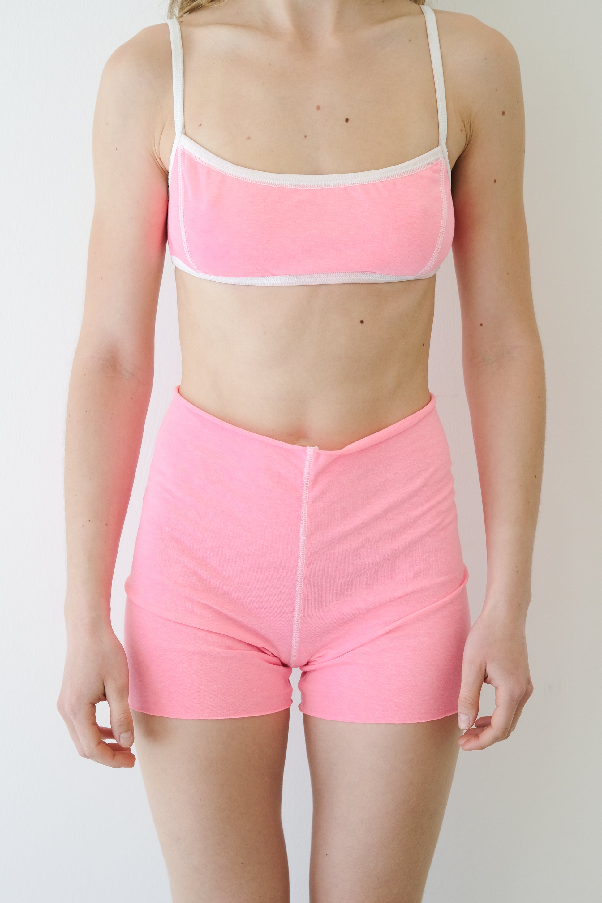 BUBBLE GUM- A bold bubble pink with white seams.Sweet, punchy, and full of energy -like a flash of fun in your everyday flow. Finished with exposed white overlock seams for that playful, sporty edge.